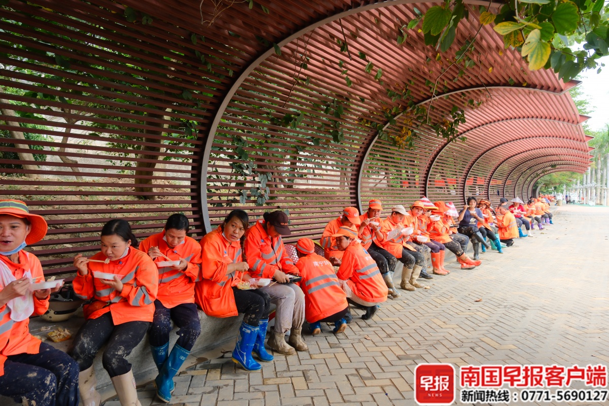 当天11时,正在南宁市中尧岭头凰竹盐鸡店,该店老板朱世才和员工正正在打包饭菜,赶正在12时前送给正正在邕江沿岸清淤的环卫工人。打包完毕,南国早报全记者跟车来到西乡塘区江北大道江滨公园段。此时气候炎热,上百名环卫工人正正在用水带、铲子清淤,清淤后的绿化带、步道公园恢复如新。